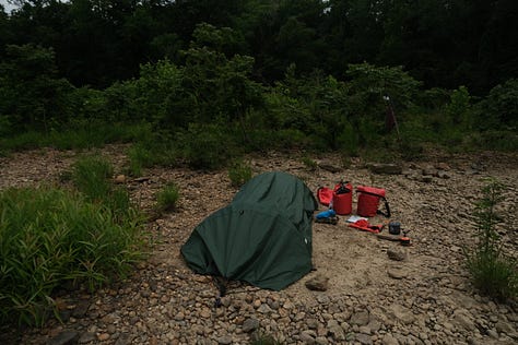 The longer the day wore on the more people I started seeing. Folks were on the bank fishing, kayakers were out in number, and I ran across a group of paddlers who were breaking down camp. Odd for a Monday, I thought. Finally, the moment came when I rounded the bend and the 100ft high railroad trestle loomed over me. And then, with little fanfare and one brief water-splashed toe-curling moment, I was past it. All of those days spent worried about this one spot, and it was over in a dozen breaths. More gratefully though, the refuge was just beyond.
